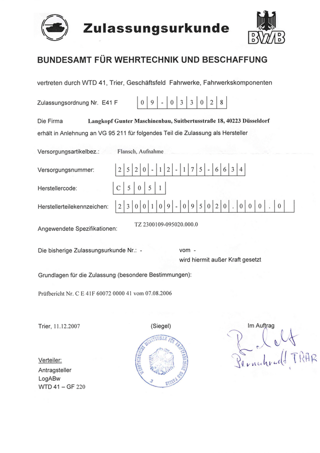 Der Prozess zur erfolgreichen Zulassung von Ersatzteilen durch die WTD Trier, ist uns bestens bekannt. Bei Bedarf können Zulassungen jederzeit durch uns beantragt werden.